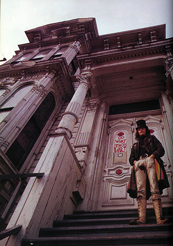 By this time BeauSoleil had moved in as a housemate with Anger at a creaky Victorian mansion known as the “Russian Embassy” and perched on the uppermost corner of Alamo Square. A contemporary photo taken inside the house shows BeauSoleil sitting center-stage and holding his electrified bouzouki, the number 666 emblazoned on the chair back above him, surrounded on either side by the motley members of the Magick Powerhouse. While their collective reputation lives on, the names of these musicians—street performers of various stripes whom BeauSoleil had discovered at neighborhood corners and cafés—have long been forgotten.