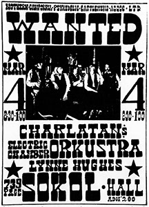 The process of finding musicians to join up with me for this little adventure began with handwritten notices that I prepared on 5 by 8 inch cards using pens of assorted colors to attract the attention of passersby. With these I let it be known that the “world’s first psychedelic electric symphony orchestra” was “now forming,” and that musicians of any stripe may apply, “all types of instruments welcome.” Interested musicians were advised to “see the guy in the top hat with the white dog on Haight Street,” or to leave their contact information on my message board in front of the Straight Theater. Bulletin boards were very commonplace in those days, and I posted the notices on every one of them that I could find—in the Psychedelic Shop, the Haight Levels, the Digger’s free store, several local markets, the Donut shop, and on my own message board in front of the Straight Theater—as well as in the windows of a few shops and restaurants I frequented regularly. The response was virtually instantaneous and surpassed my wildest expectations.
