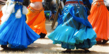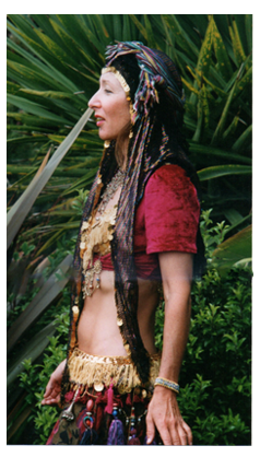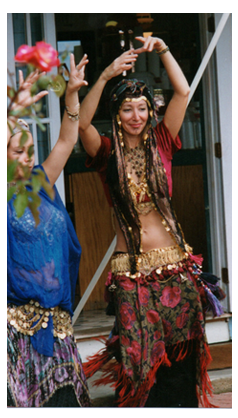 Some people call us belly-dancers, but this is a deceptive term, one that brings to mind a scantily clad woman shimmying and gyrating across the floor. Our dances are based on Middle Eastern movements and rhythms, but we draw from many other disciplines as well, from ballet and flamenco, to Native American and Polynesian. We are fusion folk dancers. We dance at festivals and fairs, weddings, parties and proms. We dance for the sheer joy of it, for the pleasure of moving our bodies through the air to the rhythm of the drums, and because it is a sacred Tantric ritual, one that joins us at the hip and the heart. We begin our ritual with a hot bath, preferably in a deep claw-foot tub. After the bath, the dancer starts assembling the multiple layers of her costume. We start with harem pants. Since these are closest to the skin, the kind of fabric they are made of is very important. It must be soft and fairly light, not too heavy, stiff or scratchy. It must feel good against your skin. I prefer cotton or silk. The color will depend on the rest of the costume. I have a dozen pairs of harem pants to choose from, in a myriad of colors. Getting dressed is like turning yourself into a piece of art- a colorful sculpture that moves. A full circle kirt goes over the harem pants. The fabric must have some weight to it so that it flares out as the dancer spins, exposing the billowing harem pants beneath.