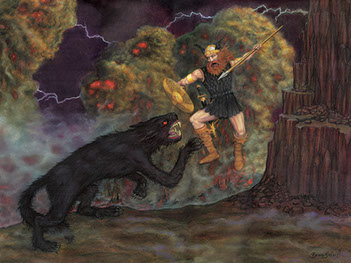 My latest painting Tyr and Garm: Battle at the Gates of Hel is dedicated to my dear friend Jason. In his day job as a criminal defense attorney, Jason regularly does battle with the monsters of duplicity, inequity, and vagaries in criminal law. When not engaged in his legal practice, Jason enjoys pursuing other avocations, including a more than passing interest in the hero stories from Nordic mythology. He has a particular affinity for Tyr, alternately referred to as the sky god, the god of war, and the god of weapons.