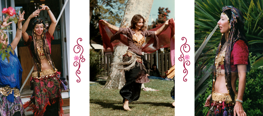Some people call us belly-dancers, but this is a deceptive term, one that brings to mind a scantily clad woman shimmying and gyrating across the floor. Our dances are based on Middle Eastern movements and rhythms, but we draw from many other disciplines as well, from ballet and flamenco, to Native American and Polynesian. We are fusion folk dancers. We dance at festivals and fairs, weddings, parties and proms. We dance for the sheer joy of it, for the pleasure of moving our bodies through the air to the rhythm of the drums, and because it is a sacred Tantric ritual, one that joins us at the hip and the heart. We begin our ritual with a hot bath, preferably in a deep claw-foot tub. After the bath, the dancer starts assembling the multiple layers of her costume. We start with harem pants. Since these are closest to the skin, the kind of fabric they are made of is very important. It must be soft and fairly light, not too heavy, stiff or scratchy. It must feel good against your skin. I prefer cotton or silk. The color will depend on the rest of the costume. I have a dozen pairs of harem pants to choose from, in a myriad of colors. Getting dressed is like turning yourself into a piece of art- a colorful sculpture that moves. A full circle kirt goes over the harem pants. The fabric must have some weight to it so that it flares out as the dancer spins, exposing the billowing harem pants beneath.
