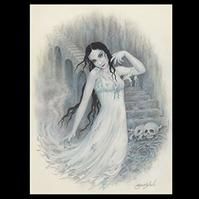 BELLA MORDACIA is a painting of a vampiress I did in 2011 for a client who would eventually sign on to be my girl friday. Some aspects of her countenance are depicted here. In addition, the inspiration for this piece was the character Vampira who appeared in a few cinematic classics such as Plan Nine From Outer Space, where she haunted the screen with Bela Lugosi in a reprise of his signature Dracula persona (turns out it was all part of a space alien plan to feed on humanity). Plan Nine is positively one of the most influential wedges of horror-cheese ever infused into celluloid. If you've seen this gem you know just what I mean! Yet a far cry more engaging than the Twilight series of films, whose protagonist is merely a wussy distant descendant of Vampira, the immortal queen of them all whose otherworldly manner is reflected in this image.