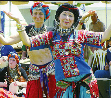The drums begin and the dancers move out into the space provided. We love to dance outside because there is plenty of room to move. There are fourteen dancers in our troupe, and when we are all dancing at the same time, we take up quite a bit of space. Zaghreets trill out and people gather around to watch. The dancers begin to accompany the drums with their zills (finger cymbals) and the dance begins. Sparkling bodices, twirlingskirts, flashing harem pants, the sounds of drums and zills draw the audience into the sacred space. Spellbound, they become embraced in a Tantric ritual invoking the Goddess Shakti.